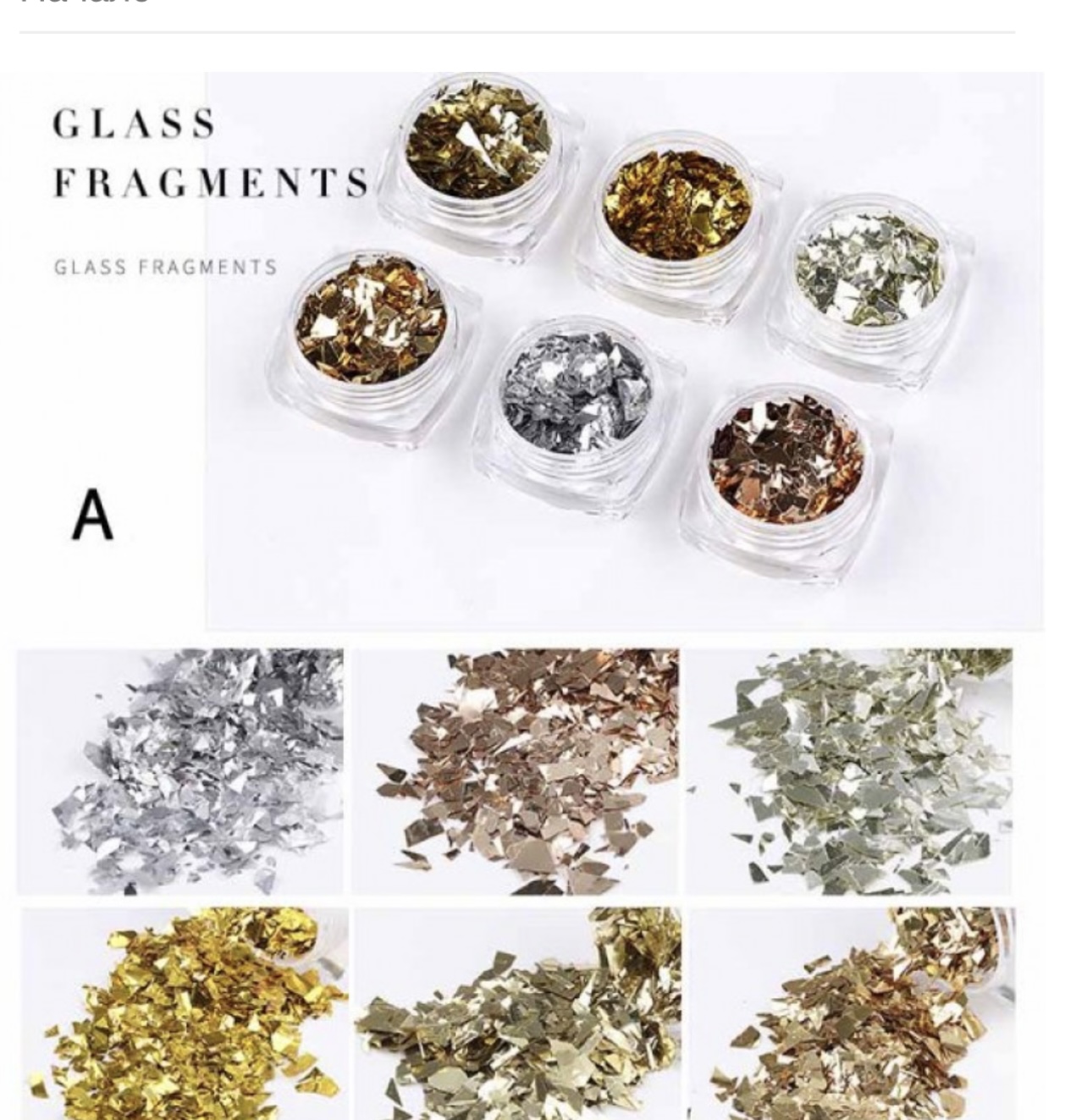 Ефектни декоративни фрагменти тип „натрошено стъкло“, идеални за UV и епоксидна смола, ноктопластика, свещи, скрапбукинг и различни арт проекти. Комплектът включва 6 металически и перлени цвята, всеки в собствено кутийка, което улеснява използването и съхранението.