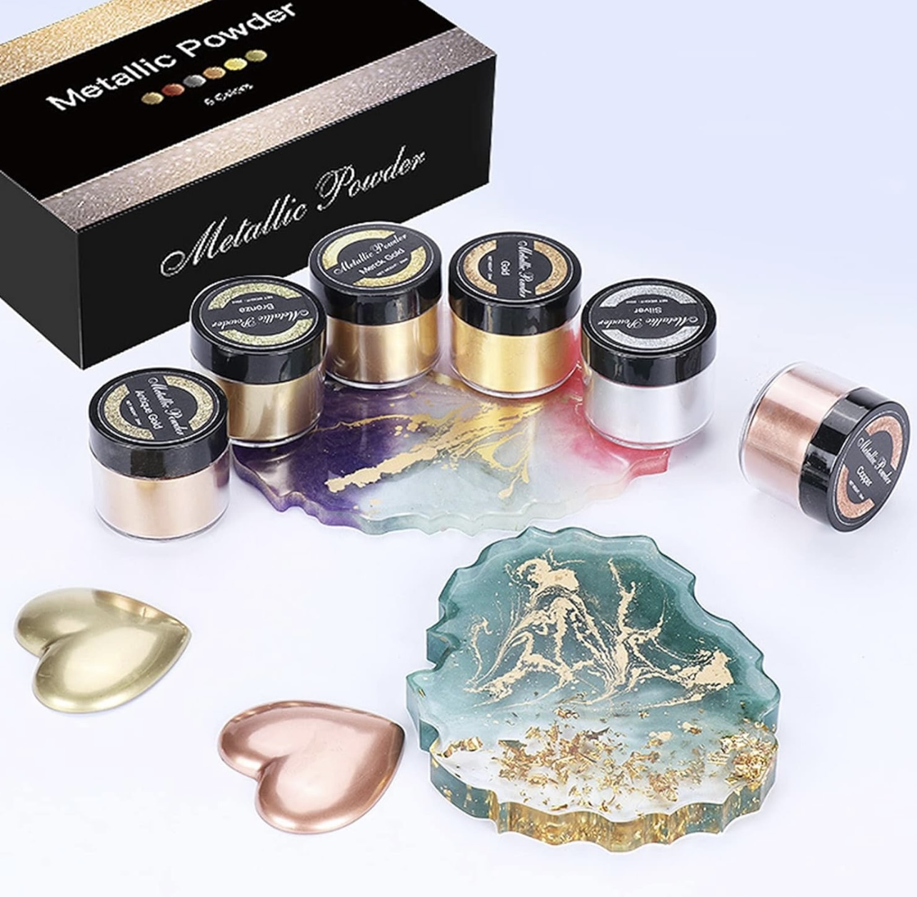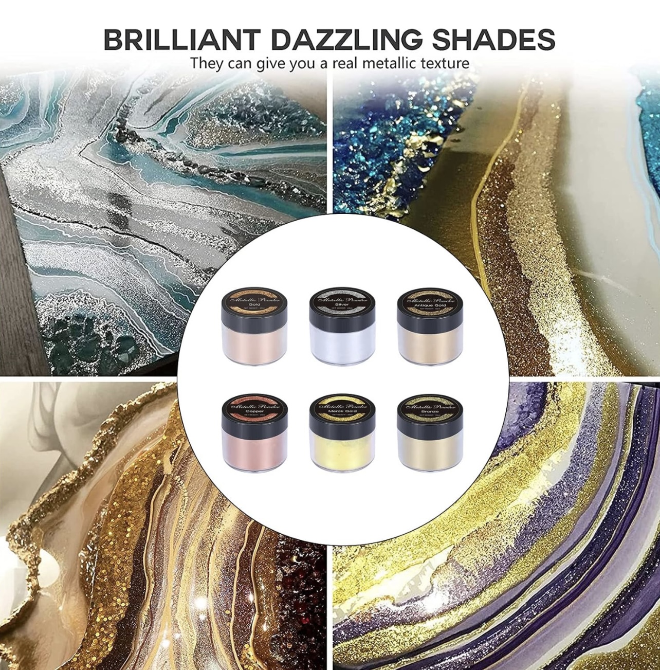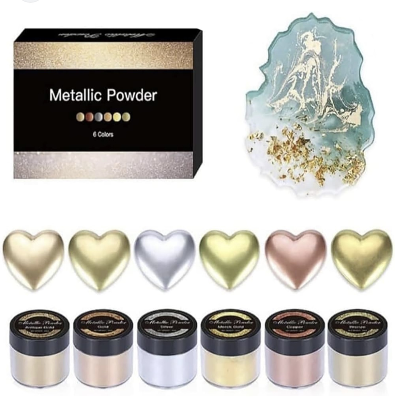 Добавете луксозен металически ефект към вашите творения с този комплект от 6 висококачествени пудри. Подходящи са за работа с епоксидна смола, UV смола, полимерна глина, восък за свещи, картички, декор и смесени арт проекти.