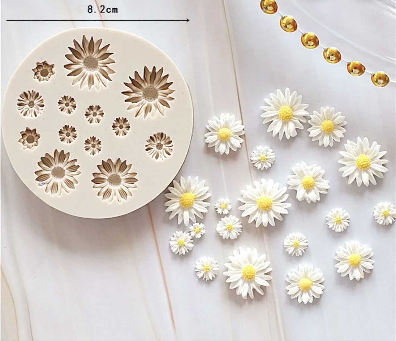 Силиконов молд за изработка на цвете тип „Маргаритка“. Подходящ за свещи, сапуни, епоксидни смоли и UV смоли. Молдът позволява да се получат реалистични маргаритки с ясно дефинирани венчелистчета и централна жълта част, характерна за маргаритката.